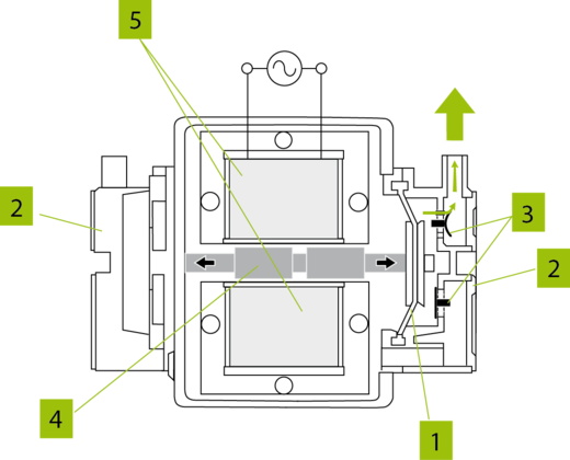 Pohyb permanentného magnetu (4), na ktorom sú membrány pripevnené, je vyvolaný striedavým magnetickým poľom generovaným párom elektro-magnetických cievok (5). Celý proces tak funguje bez mechanického trenia s vysokou efektivitou a nízkou hlučnosťou.